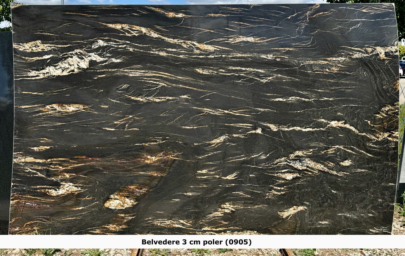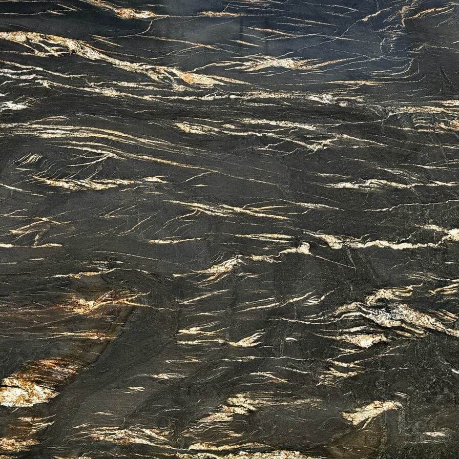 Granit Belvedere to niezwykle efektowny kamień naturalny o głębokiej, intensywnej czerni z dynamicznymi żyłami w odcieniach złota, bieli, szarości i miedzi. Każda płyta tego granitu jest unikatowa – pełna dramatycznych kontrastów i naturalnych wzorów przypominających dzieło sztuki.