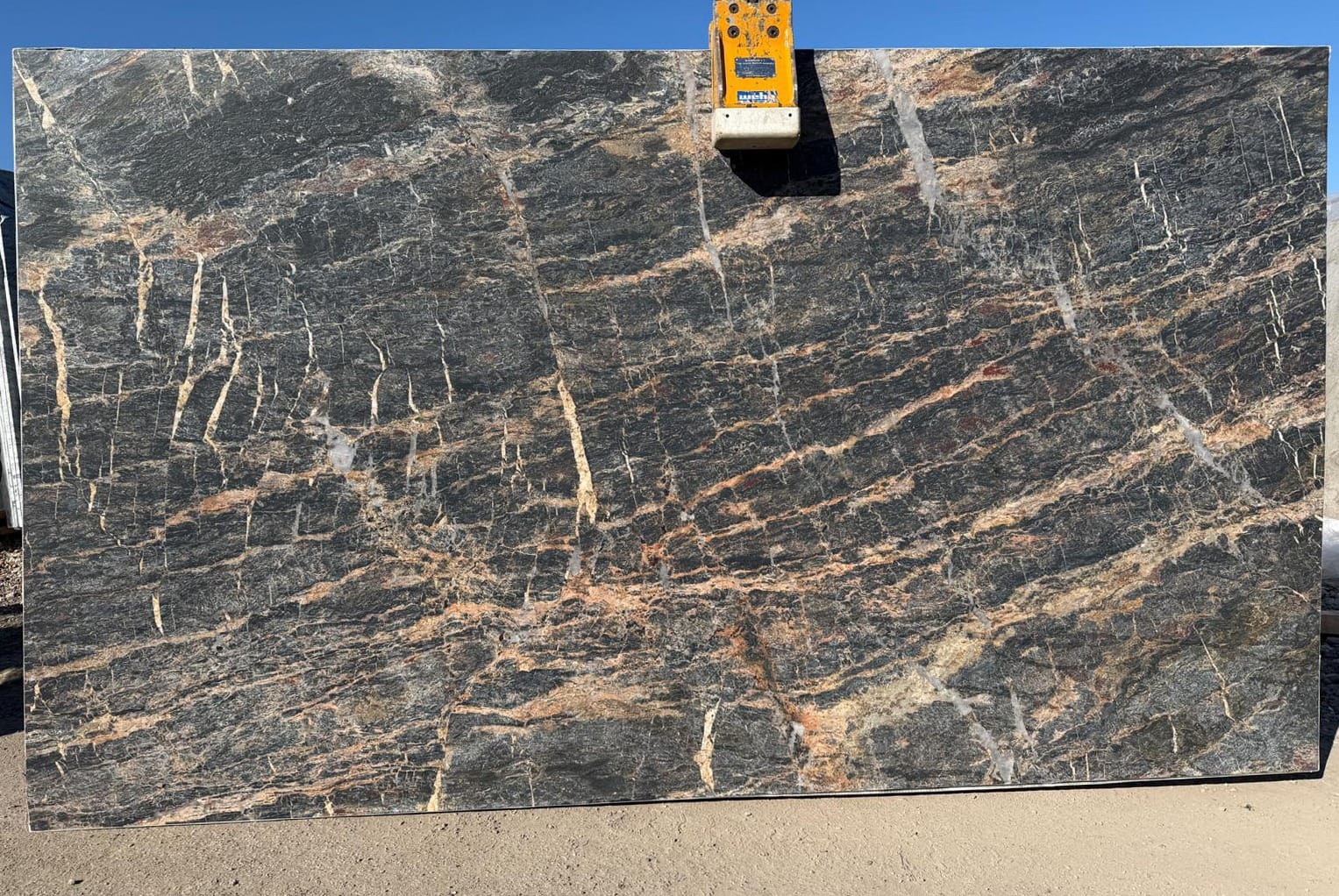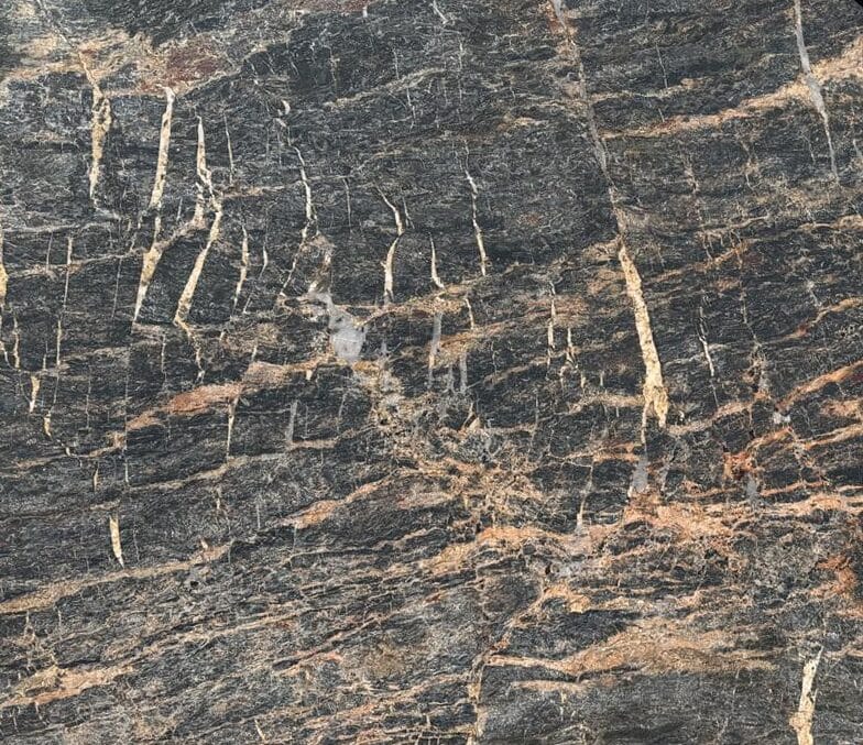 Granit Lava Oro 2 cm satyna to wyjątkowy kamień naturalny o intensywnej, eleganckiej kolorystyce oraz wyraźnym rysunku mineralnym. Powierzchnia kamienia utrzymana jest w głębokich odcieniach grafitu, czerni oraz ciemnego brązu, które przełamane są kontrastującymi żyłami w kolorze złota i jasnego beżu.