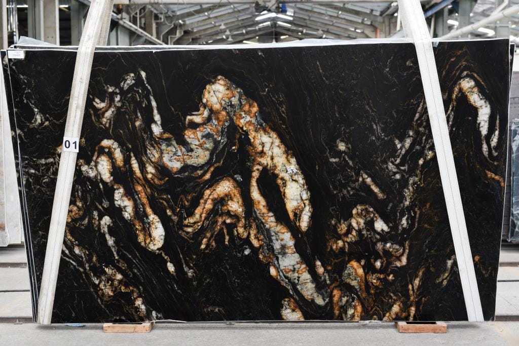 Prezentowany blok TQZ0022 w grubości 2 cm i wykończeniu poler wyróżnia się silnym kontrastem kolorystycznym oraz wysokim połyskiem, który potęguje efekt wizualny. Powierzchnia polerowana odbija światło, podkreślając złote refleksy i nadając kamieniowi ekskluzywny charakter.