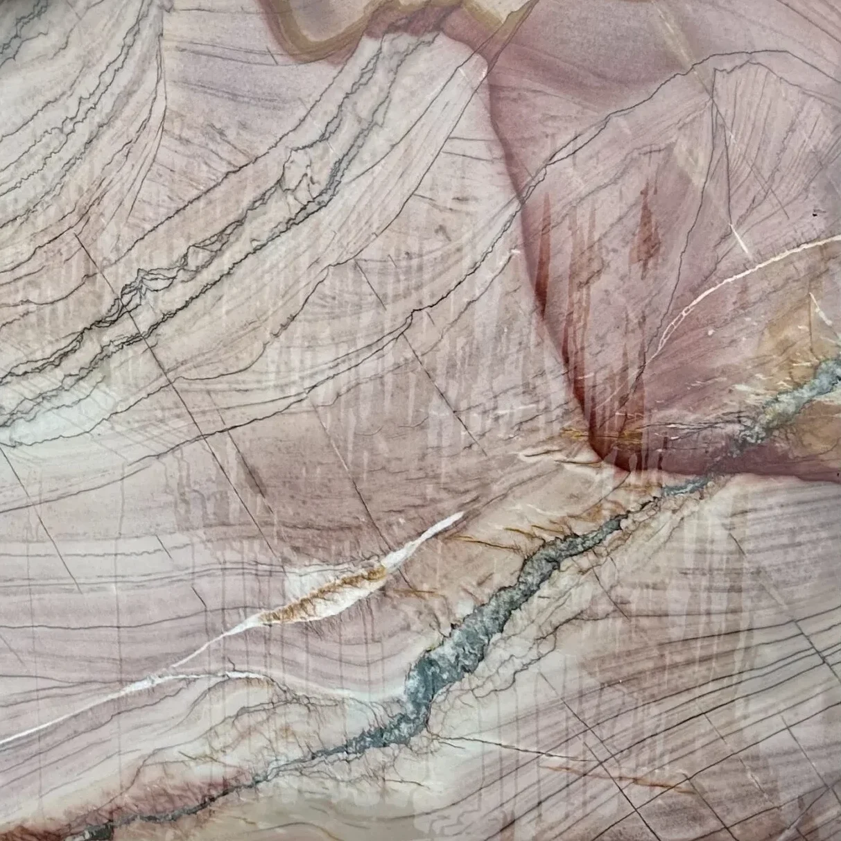 Colorado Falls to unikalny, naturalny kwarcyt o spektakularnym układzie użylenia i kolorystyce inspirowanej krajobrazem skalistych gór. Dominują ciepłe odcienie różu, beżu, rdzy i bordo, przenikające się z chłodnymi liniami szarości i błękitu. To kamień o wyjątkowej ekspresji, który nada każdej przestrzeni niepowtarzalny, luksusowy charakter.