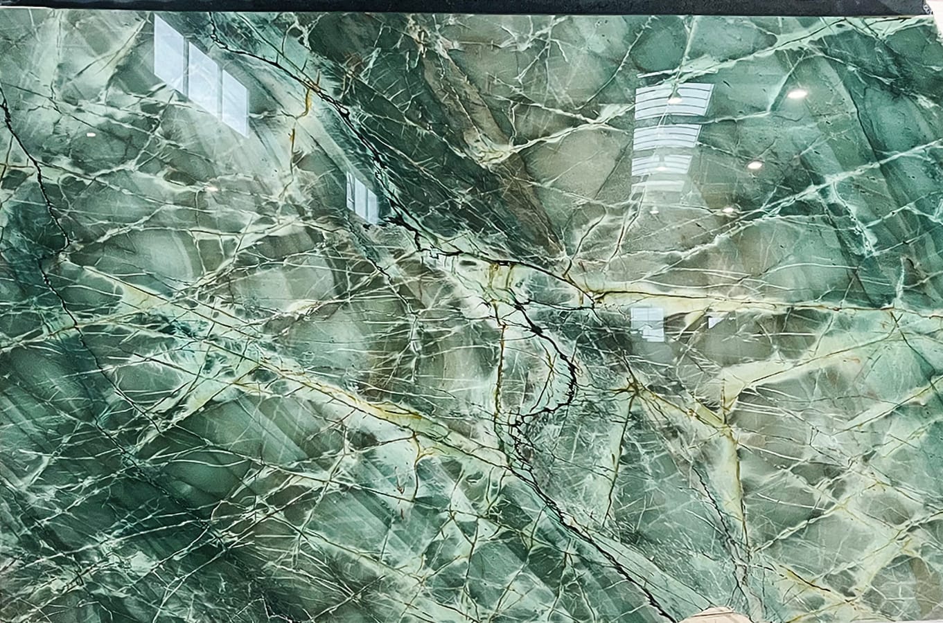 Kwarcyt Naturalny Davinci to wyjątkowy kamień naturalny wyróżniający się niezwykle efektowną strukturą oraz intensywną kolorystyką. Powierzchnia kamienia tworzy dynamiczną kompozycję w odcieniach zieleni, turkusu, szarości oraz subtelnych złotych żył, które nadają mu elegancki i ekskluzywny charakter.