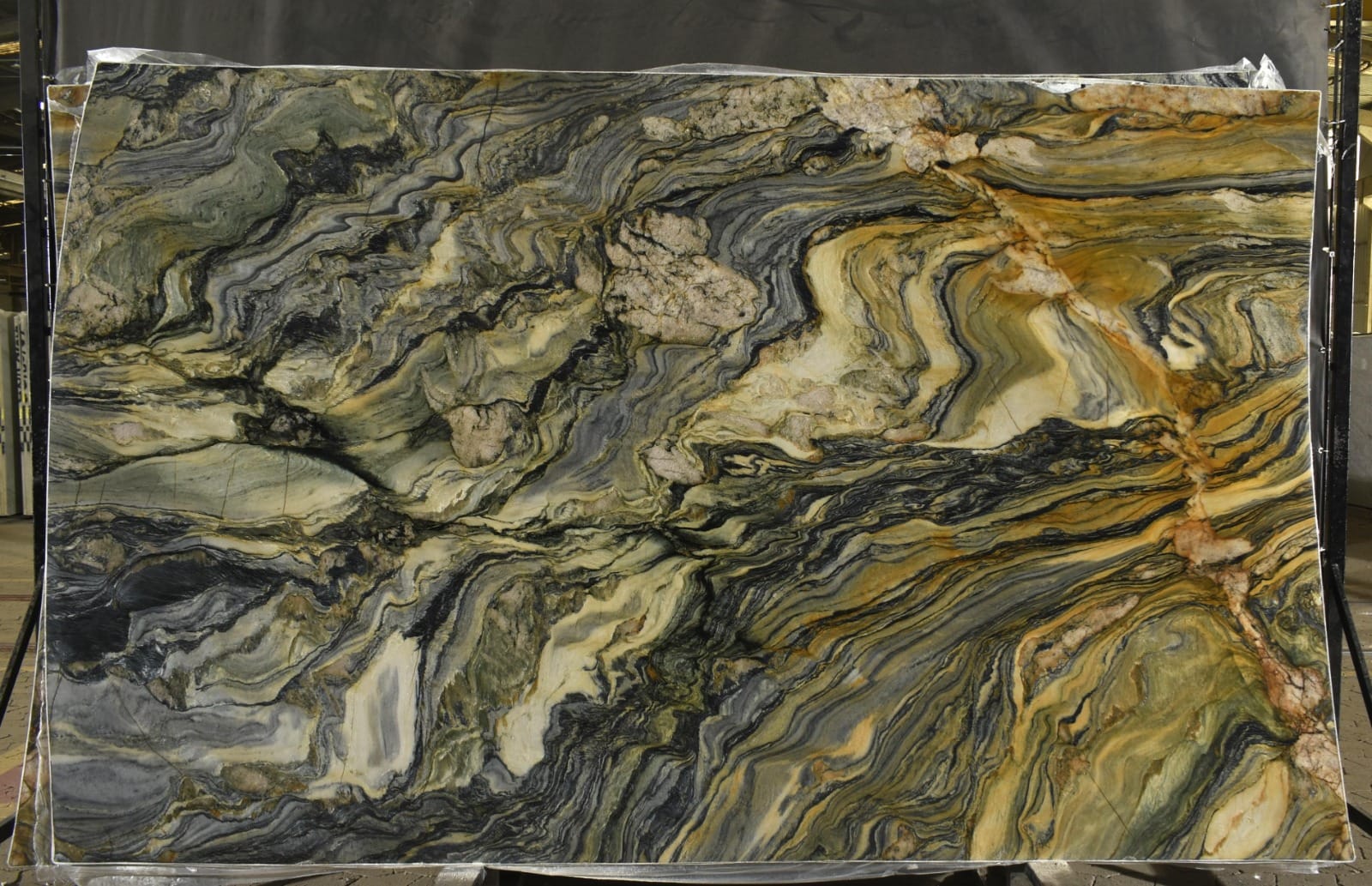 Kwarcyt naturalny Caravaggio 2 cm szlif to wyjątkowy kamień naturalny, który wyróżnia się artystycznym, falującym wzorem oraz intensywną, wielowymiarową kolorystyką. Na jego powierzchni przeplatają się odcienie zieleni, oliwki, złota, beżu oraz głębokiej czerni i grafitu, tworząc dynamiczną kompozycję przypominającą naturalne malarstwo.