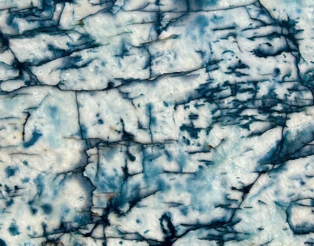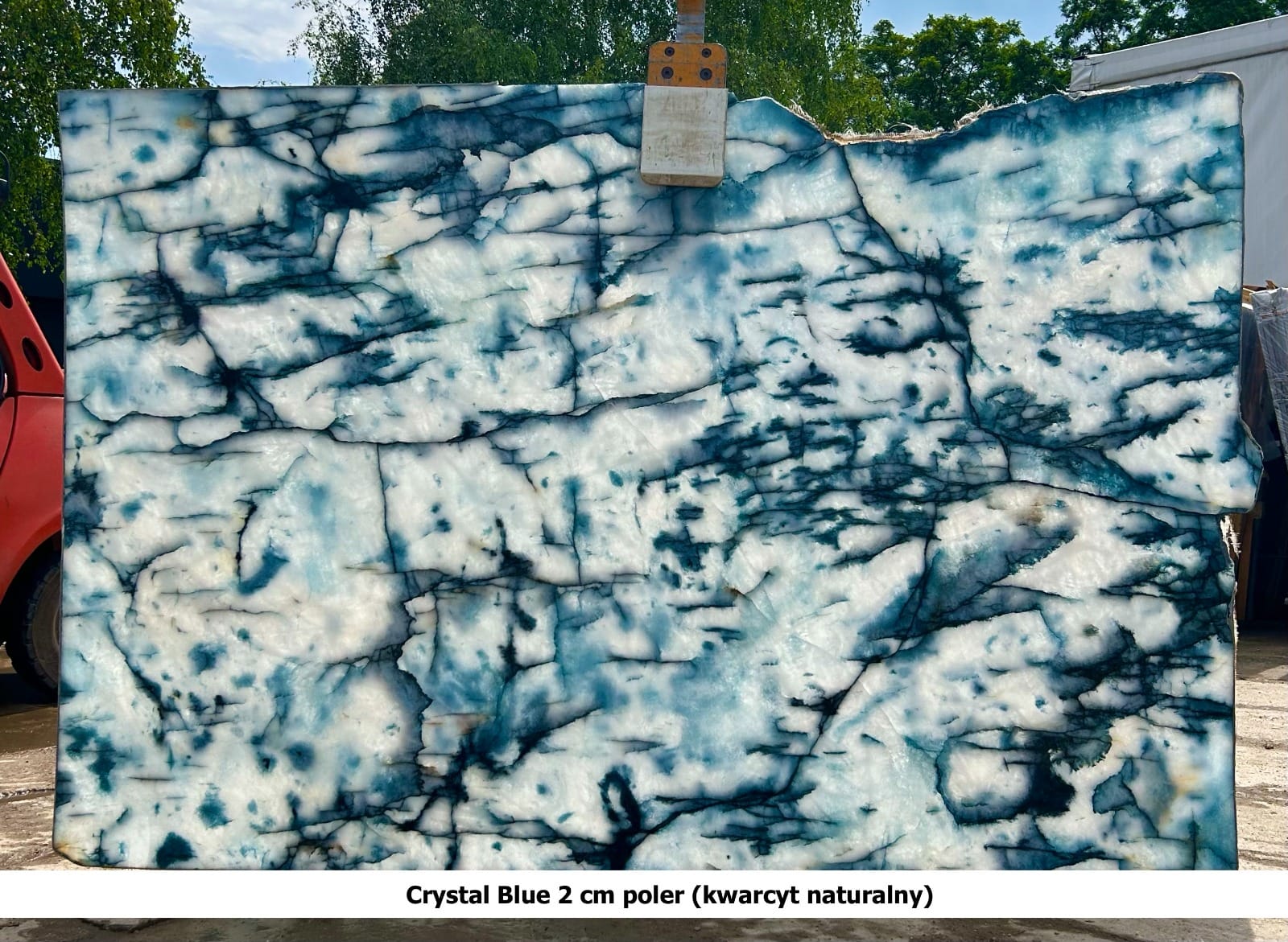 Kwarcyt naturalny Crystal Blue 2 cm to kamień o niezwykle efektownej, wręcz hipnotyzującej powierzchni. Połączenie bieli, jasnych błękitów i głębokich granatów nadaje mu lodowo-krystaliczny charakter, który idealnie komponuje się z nowoczesnym wzornictwem, wnętrzami glamour czy projektami artystycznymi. Dzięki częściowej przezierności materiał ten można efektownie podświetlać, uzyskując wrażenie głębi i świetlistego kontrastu.
