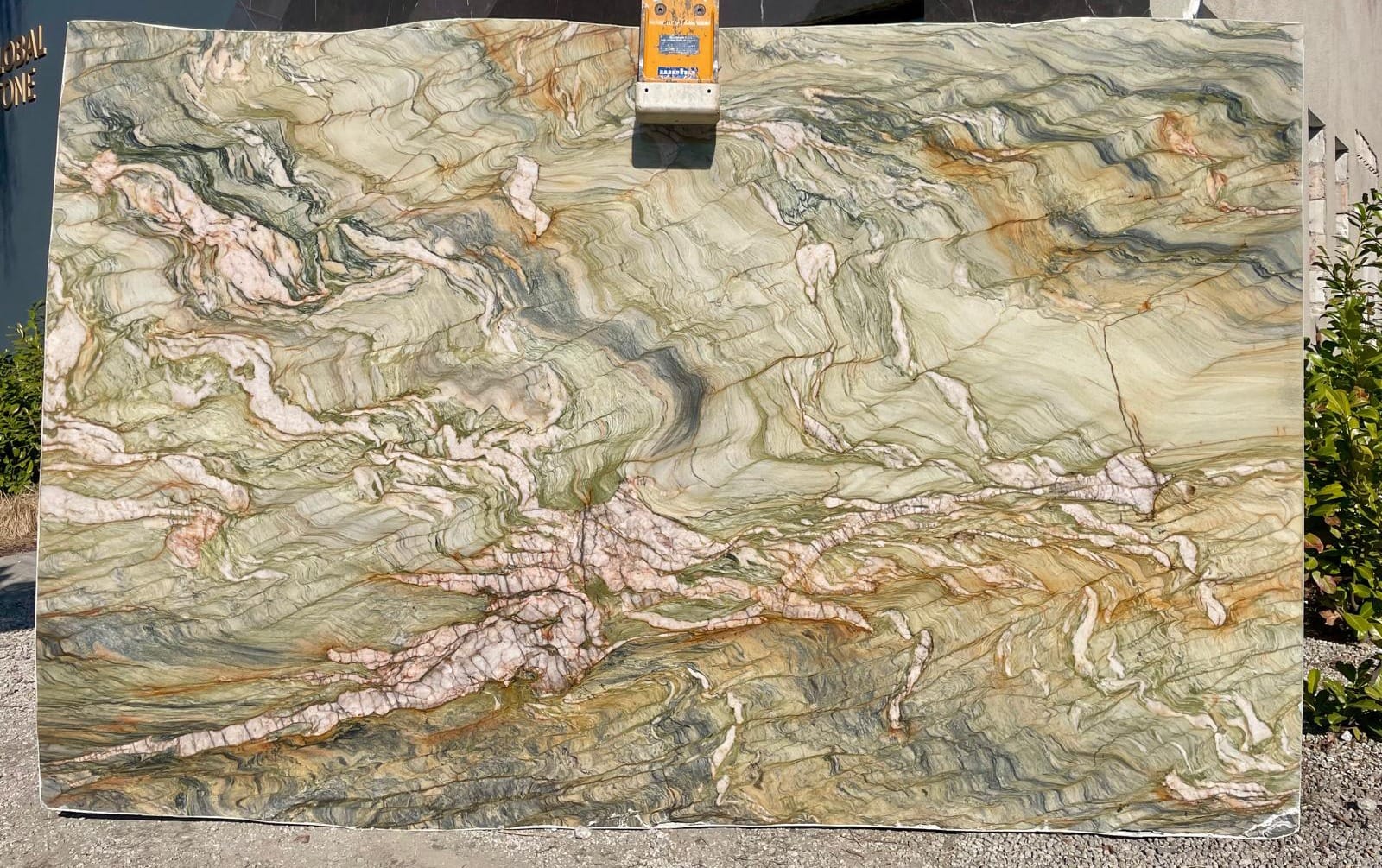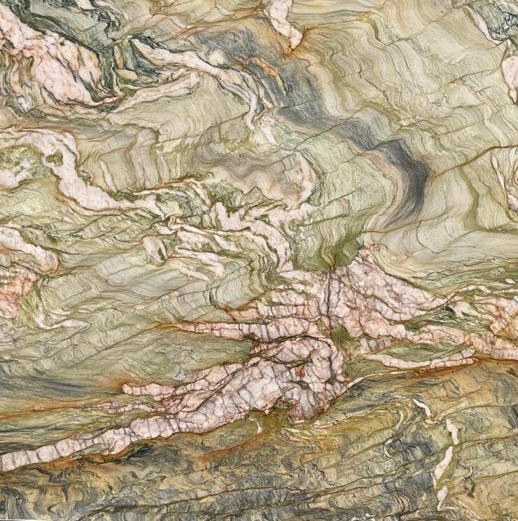 Kwarcyt Naturalny Fusion Fascination to wyjątkowy kamień naturalny, który zachwyca swoją intensywną, artystyczną strukturą oraz bogactwem kolorów. Na jego powierzchni widoczne są dynamiczne, falujące warstwy w odcieniach zieleni, oliwki, beżu, szarości oraz delikatnych tonów złota i różu, tworzące efekt przypominający naturalne formacje skalne lub malarskie kompozycje.