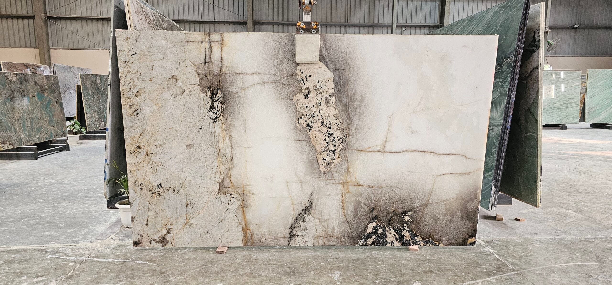 Prezentowany blok 40924 w grubości 2 cm i wykończeniu poler wyróżnia się wyraźnym kontrastem między jasnym tłem a intensywnymi, grafitowymi i brązowymi akcentami. Polerowana powierzchnia wydobywa połysk kryształów i podkreśla naturalną głębię kamienia, nadając mu wyjątkowo elegancki charakter.