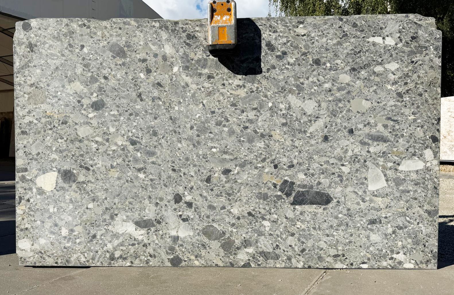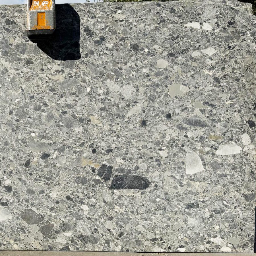 Marmur Ceppo Grigio szlif to niezwykle rozpoznawalny kamień naturalny, który wyróżnia się unikalną, gruboziarnistą strukturą przypominającą terrazzo. Na jego powierzchni widoczne są fragmenty minerałów w różnych odcieniach szarości, grafitu oraz jasnych tonów, tworzące spójną, dynamiczną kompozycję.