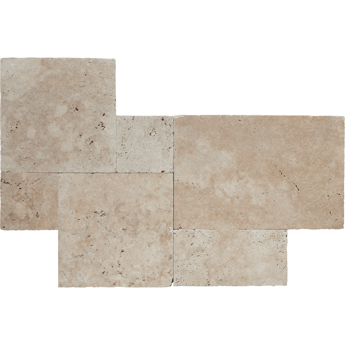 Mozaika rzymska z trawertynu Classic bębnowanego to ponadczasowy materiał wykończeniowy, który łączy naturalne piękno kamienia z klasycznym stylem aranżacyjnym. Komplet o powierzchni 0,742 m² składa się z elementów o różnych wymiarach, tworzących charakterystyczny układ opus romano, inspirowany architekturą starożytnego Rzymu.