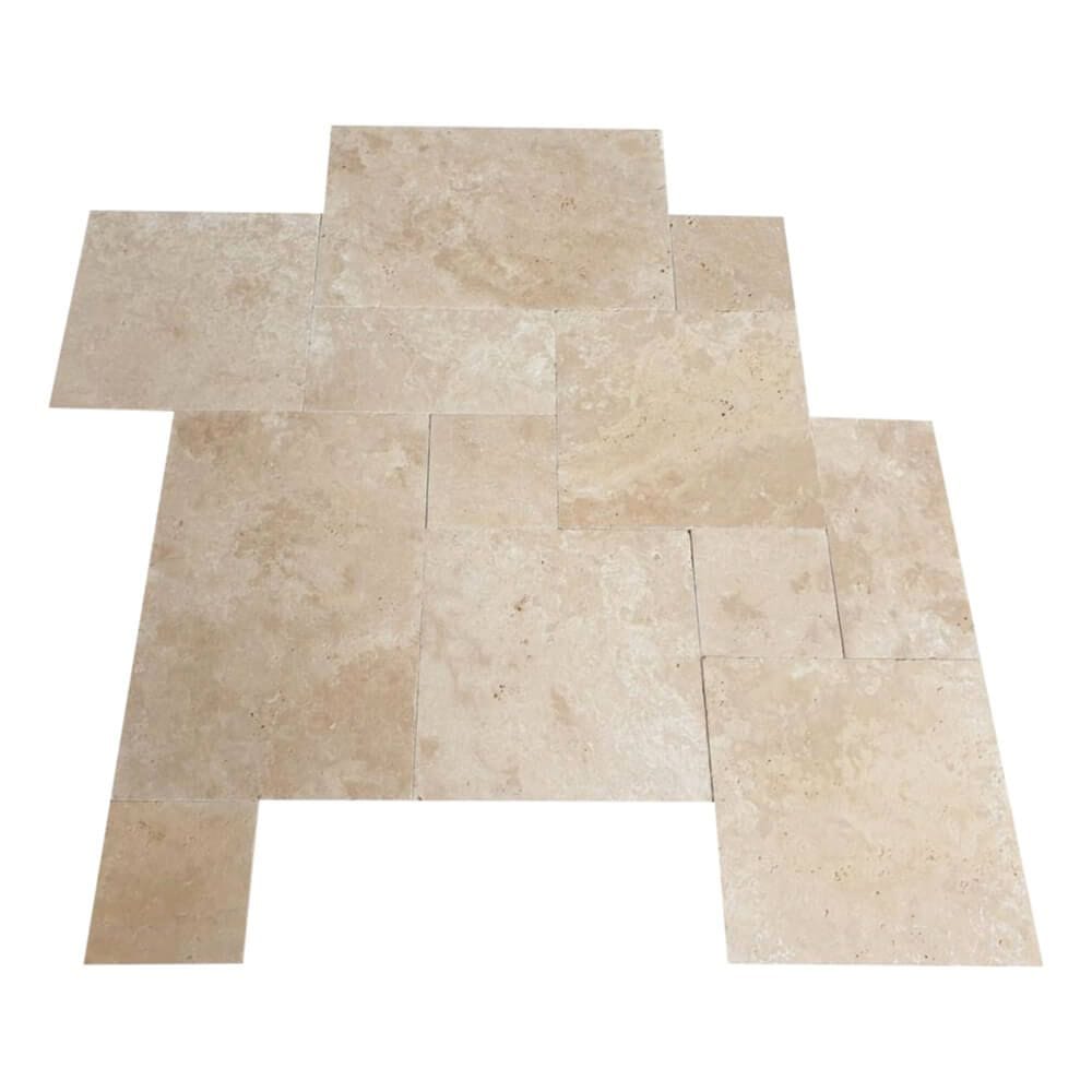 Mozaika rzymska z trawertynu Light Premium bębnowanego to propozycja dla osób, które szukają naturalnego kamienia o ponadczasowym wyglądzie i wysokiej estetyce. Komplet o powierzchni 0,742 m² zawiera elementy o różnych wymiarach, tworzące klasyczny układ opus romano, inspirowany architekturą starożytnego Rzymu.