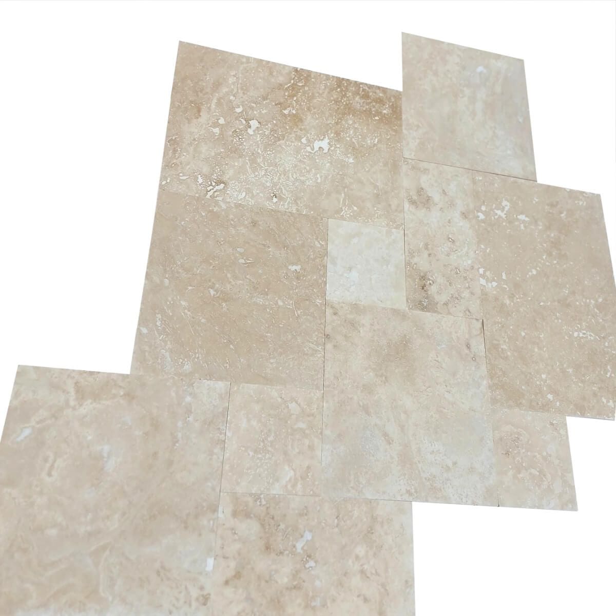Mozaika rzymska z trawertynu Light Standard szlifowanego i wypełnianego to ponadczasowe rozwiązanie dla osób poszukujących naturalnego kamienia w eleganckiej, uporządkowanej formie. Komplet o powierzchni 0,742 m² składa się z elementów o różnych rozmiarach, które tworzą klasyczny układ opus romano, inspirowany antyczną architekturą.